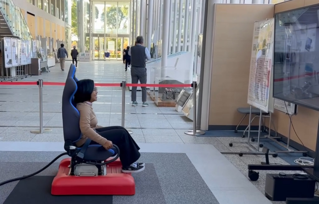 研究所では、最先端の地震防災に関する研究内容の説明を受けた後、地震体験装置を利用しました。私たちは過去の巨大地震のデータに基づき、装置の体験席にて、地震の揺れを忠実に再現した振動を体感しました。